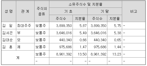 - 최대주주 및 특수관계인 지분 : 13.23% - 김일/최대주주/5.75%